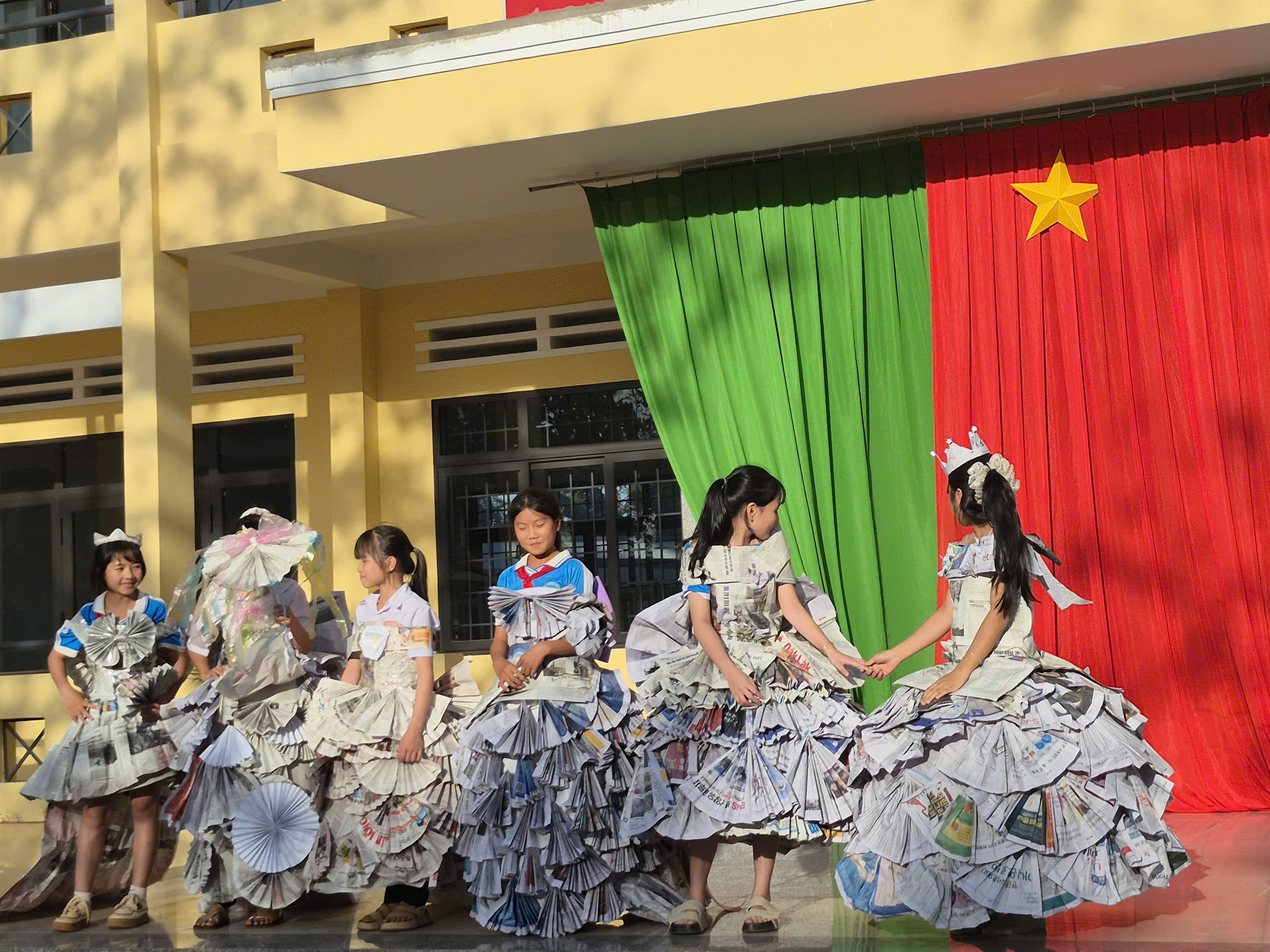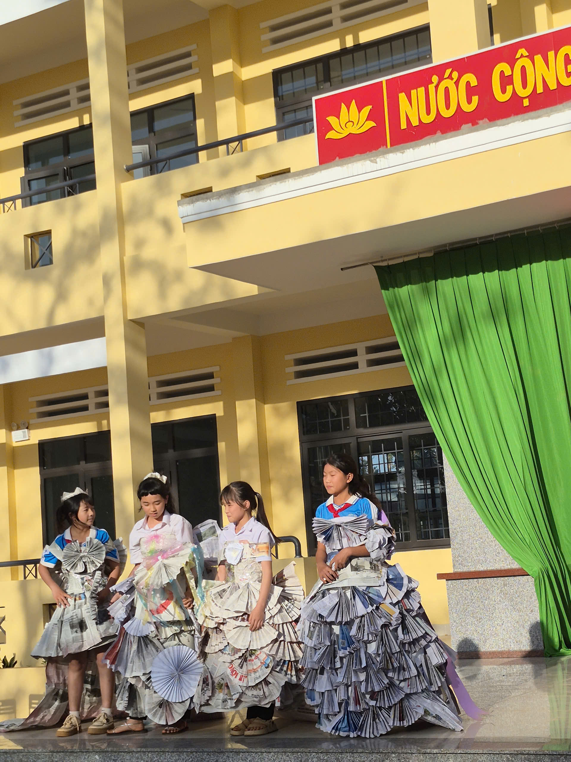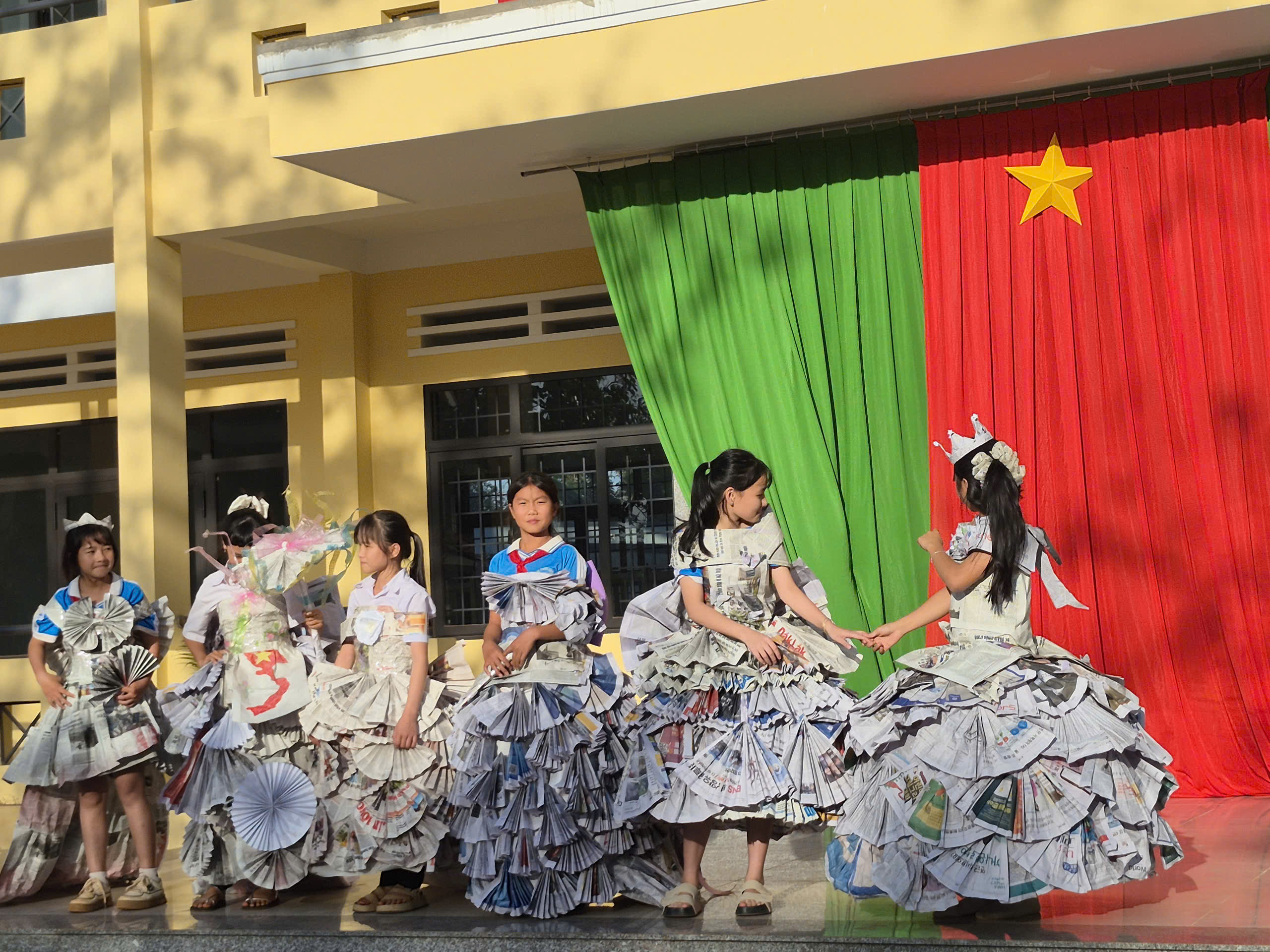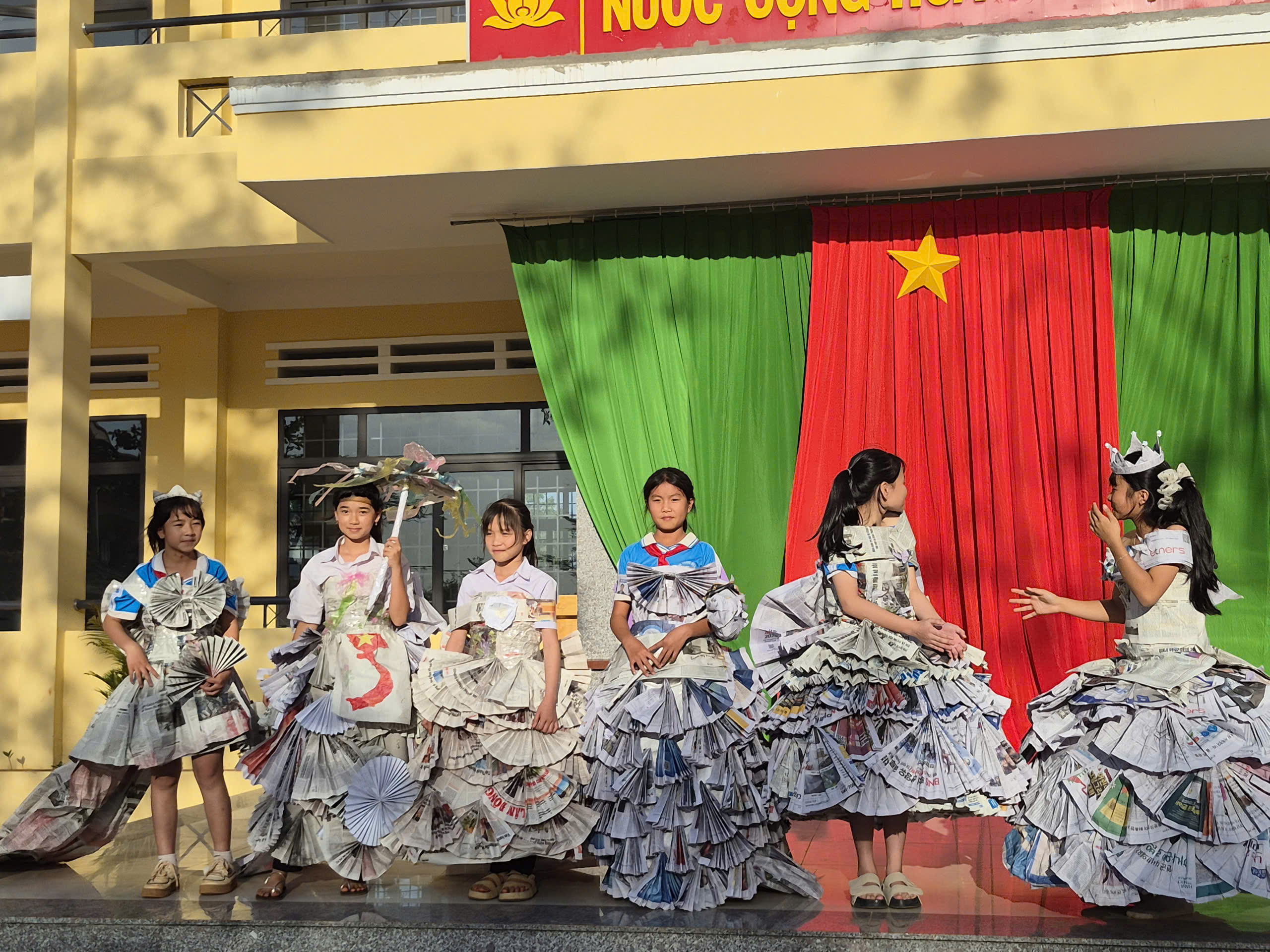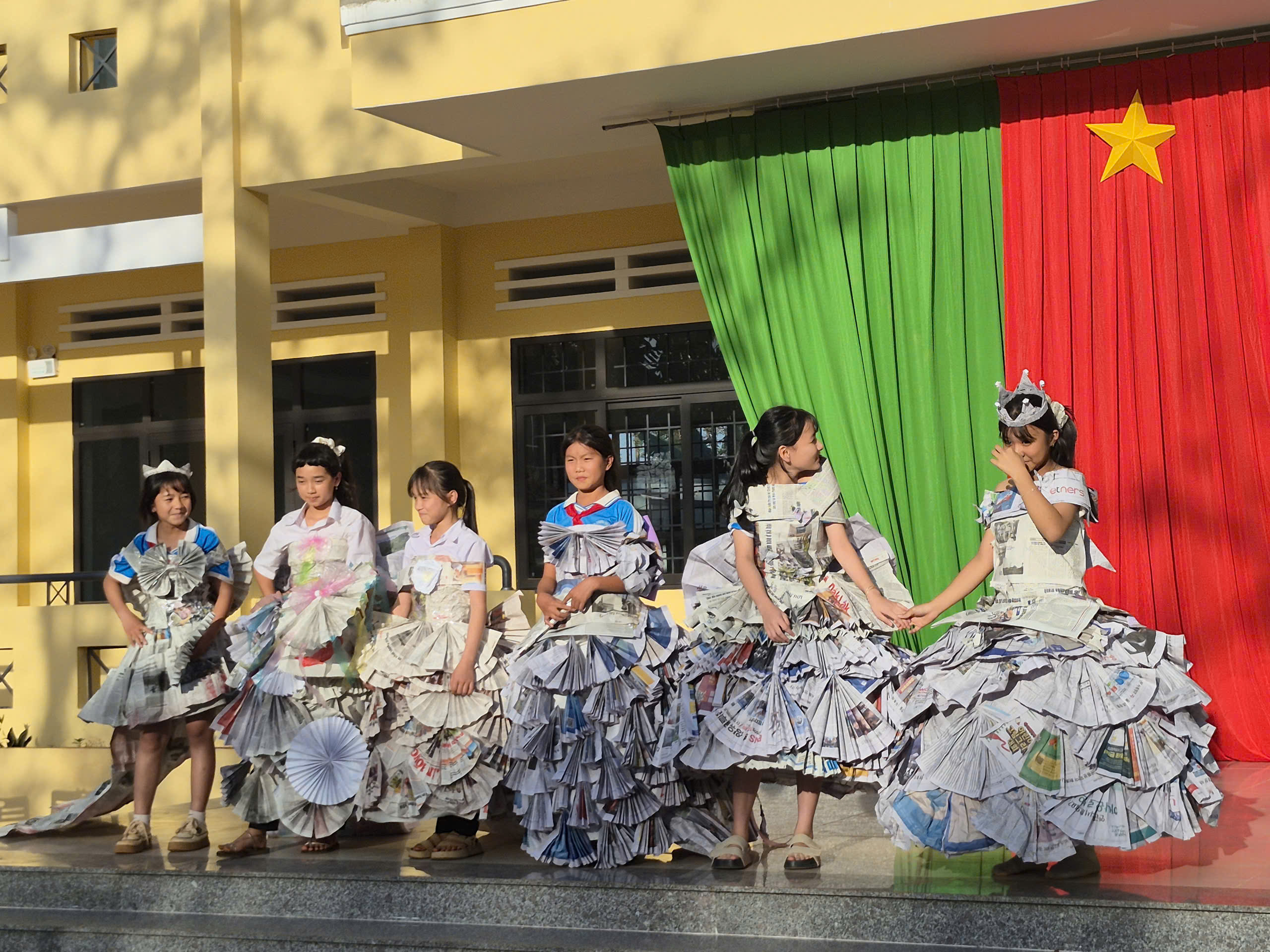 Tiếp theo chương trình là tiết mục biểu diễn thời trang tái chế của các bạn khối lớp 7. Với sự khéo léo, sáng tạo các bạn đã tạo ra những trang phục dạ hội đẹp và trình diễn trước cờ. Tạo không khí vui tươi, tự tin trình diễn của các em học sinh.