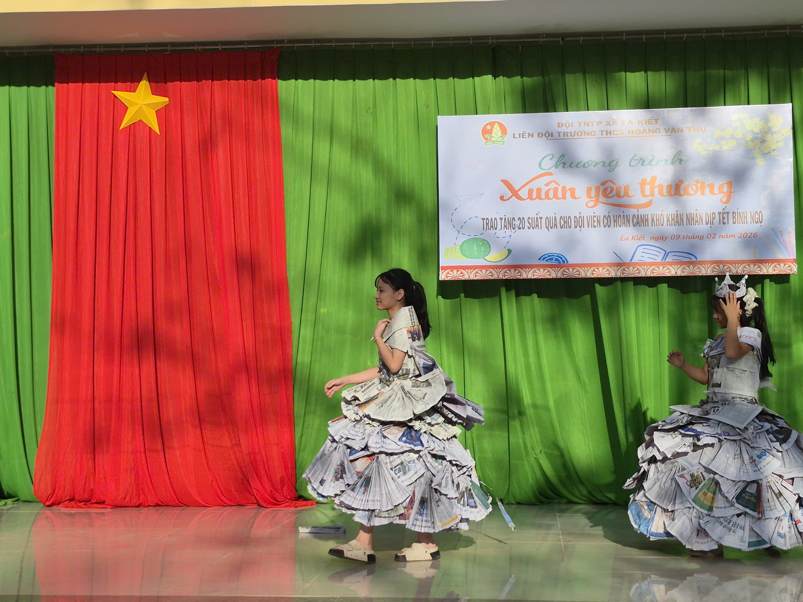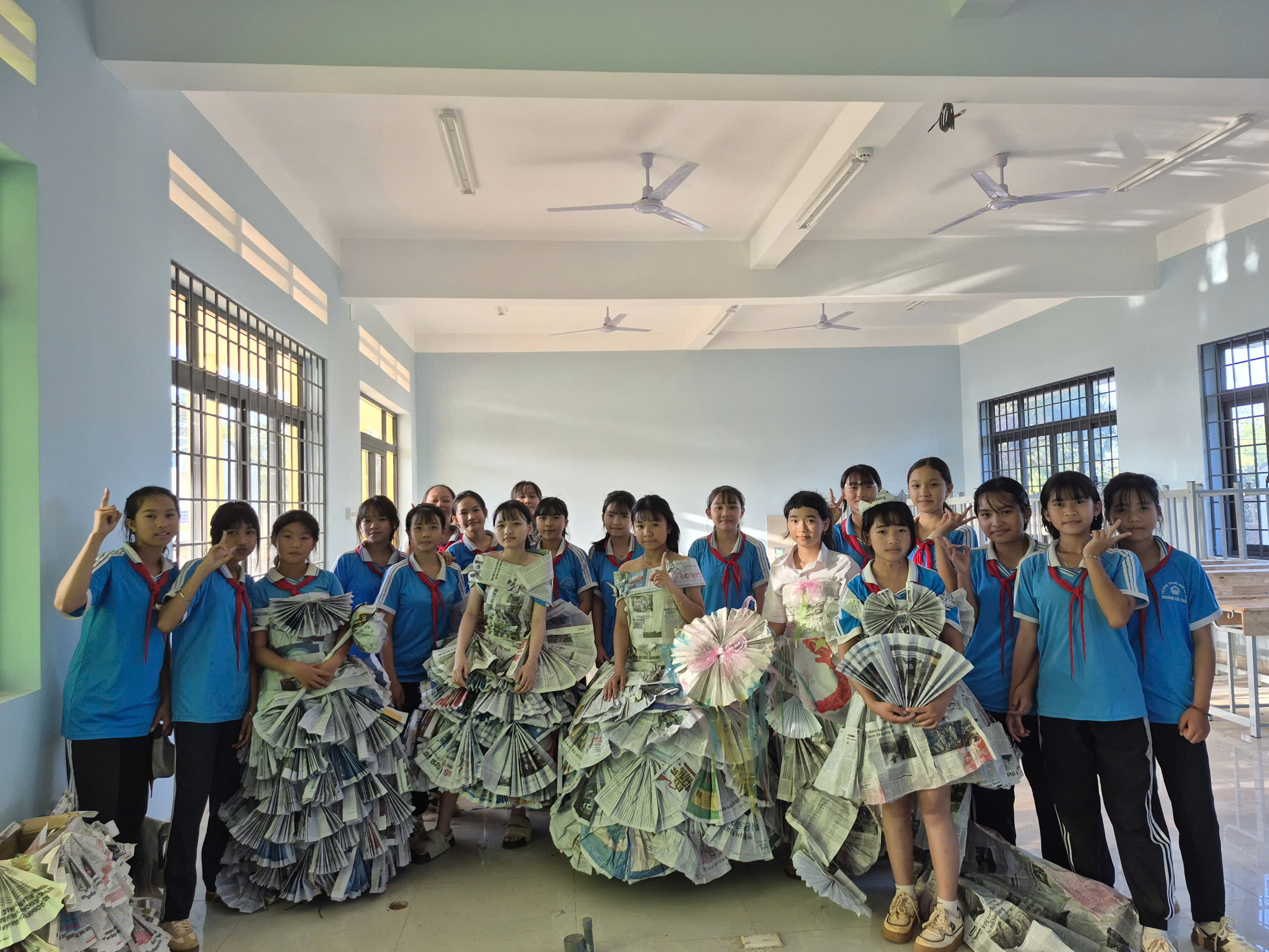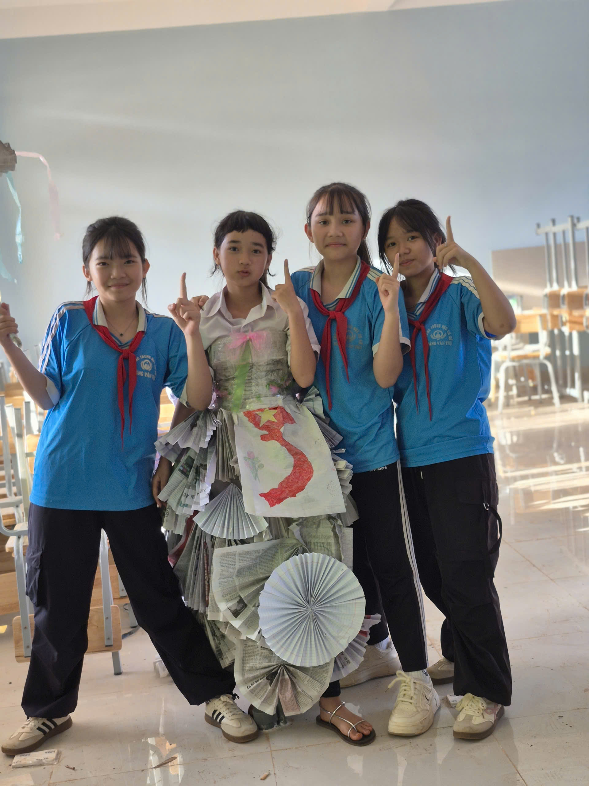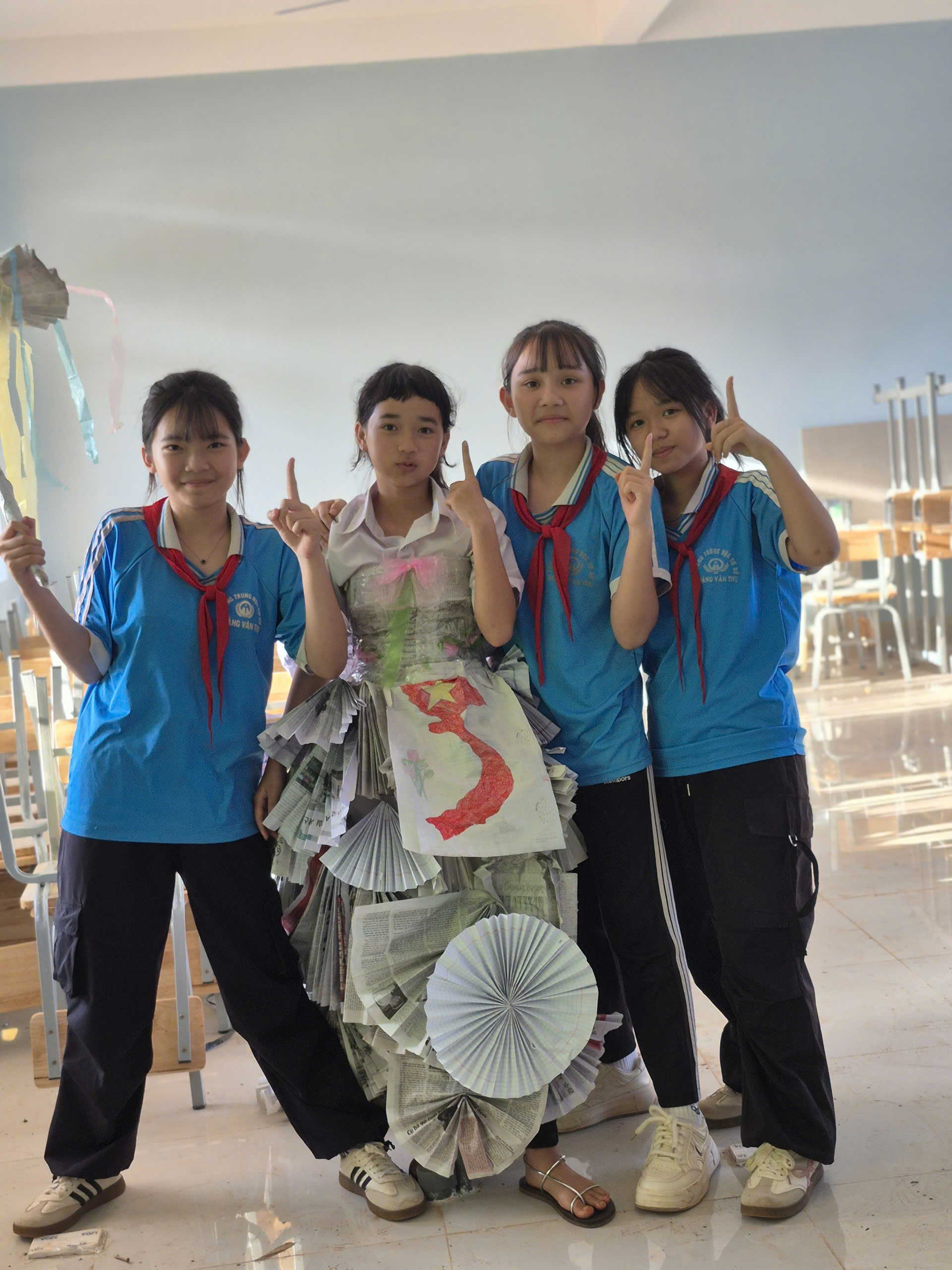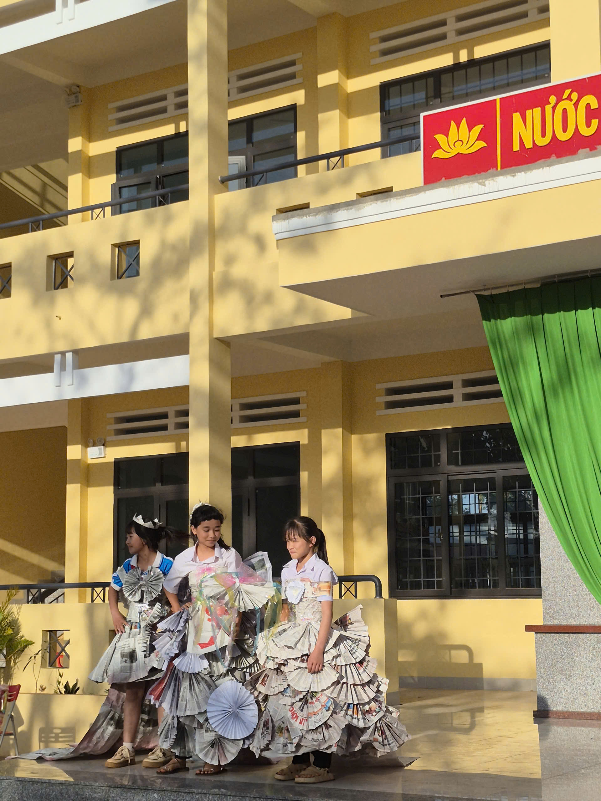 Tiếp theo chương trình là tiết mục biểu diễn thời trang tái chế của các bạn khối lớp 7. Với sự khéo léo, sáng tạo các bạn đã tạo ra những trang phục dạ hội đẹp và trình diễn trước cờ. Tạo không khí vui tươi, tự tin trình diễn của các em học sinh.