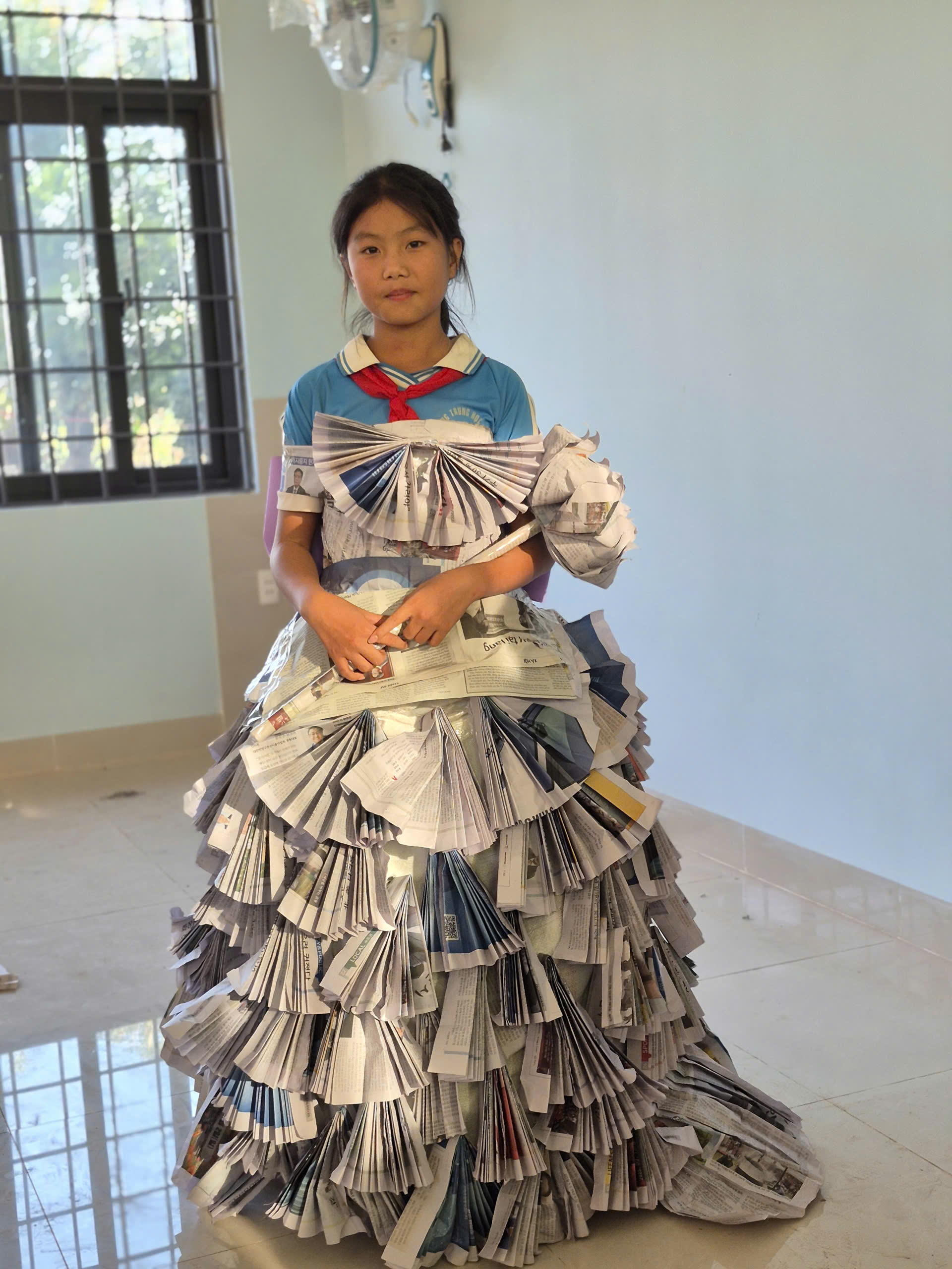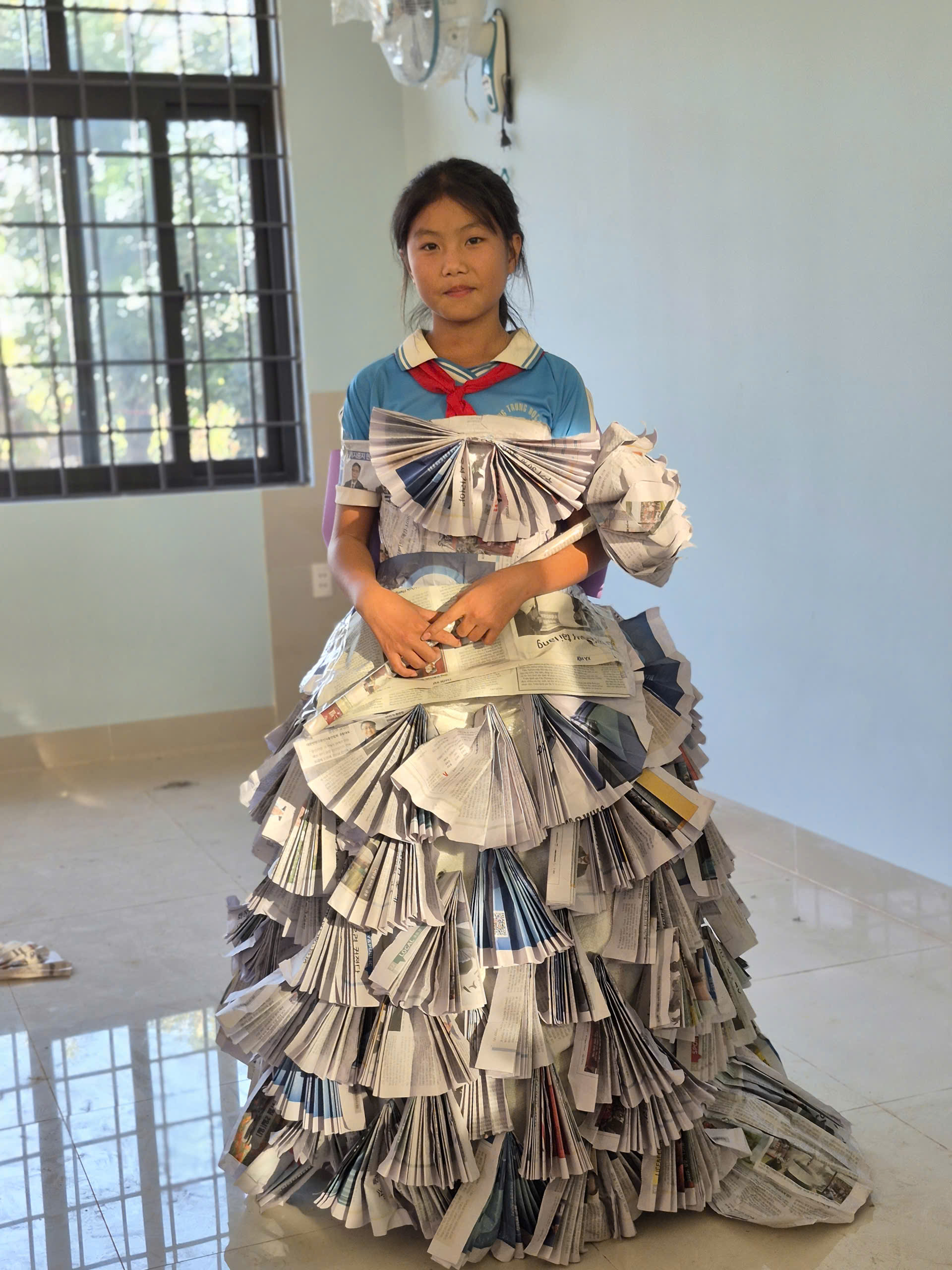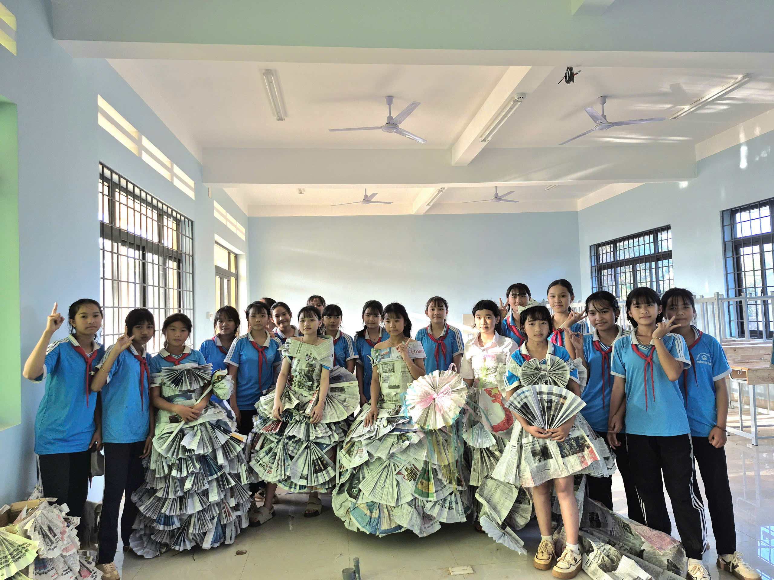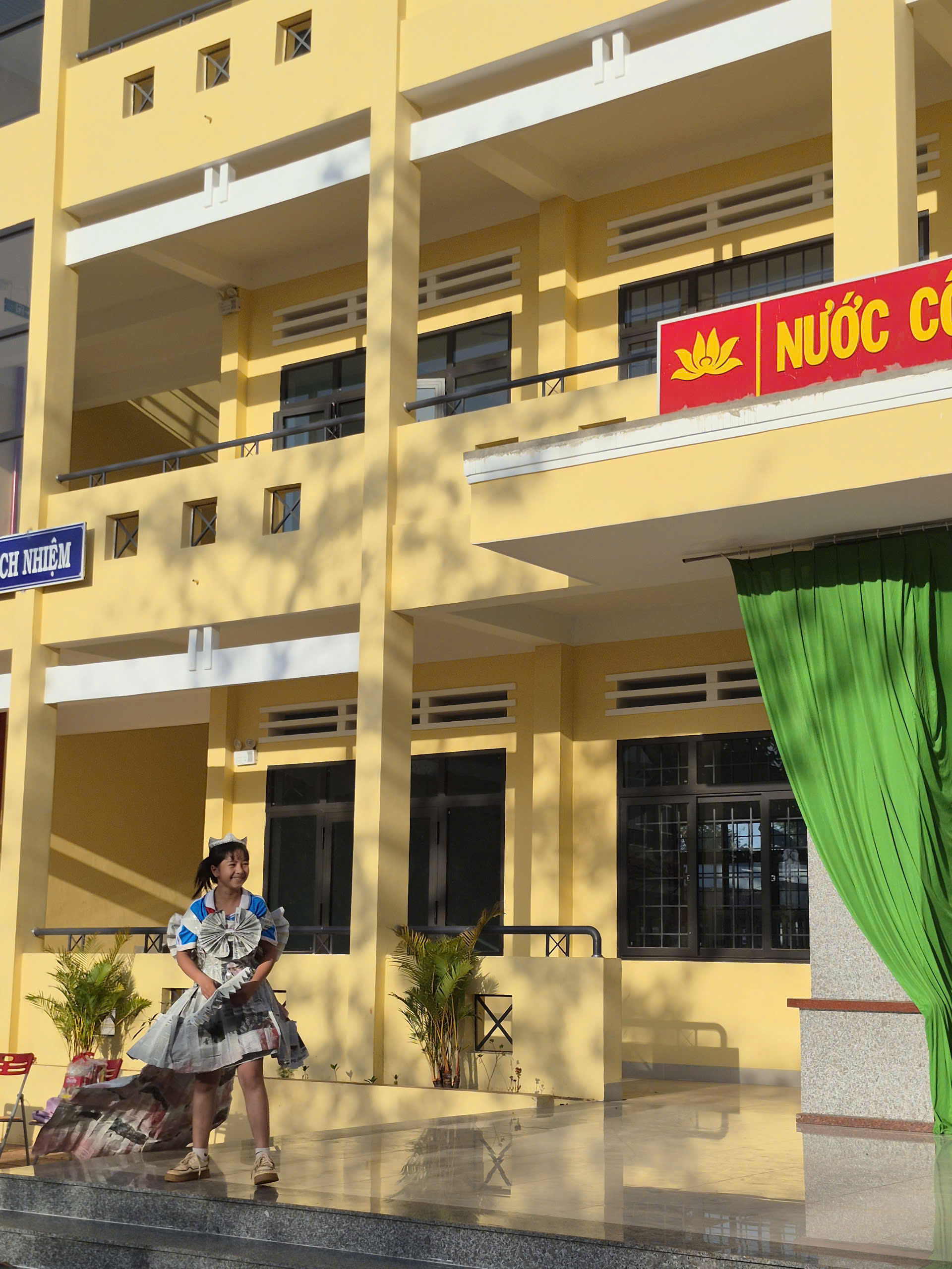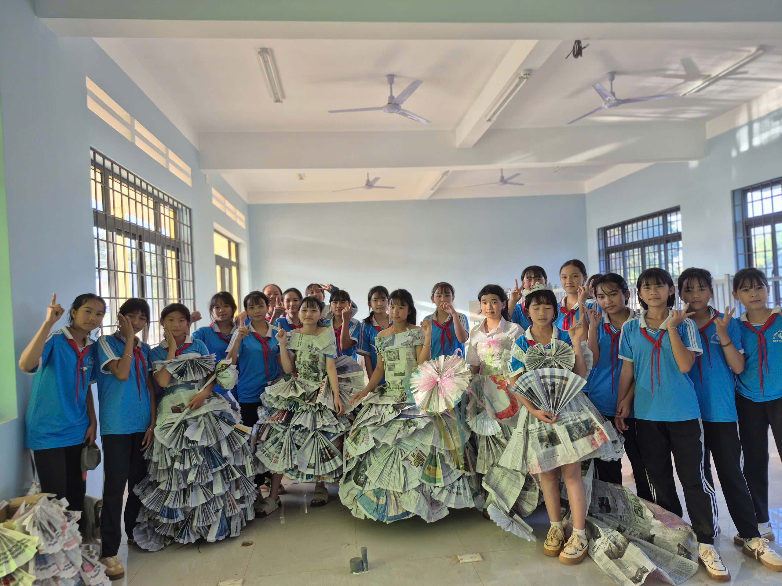 Tiếp theo chương trình là tiết mục biểu diễn thời trang tái chế của các bạn khối lớp 7. Với sự khéo léo, sáng tạo các bạn đã tạo ra những trang phục dạ hội đẹp và trình diễn trước cờ. Tạo không khí vui tươi, tự tin trình diễn của các em học sinh.