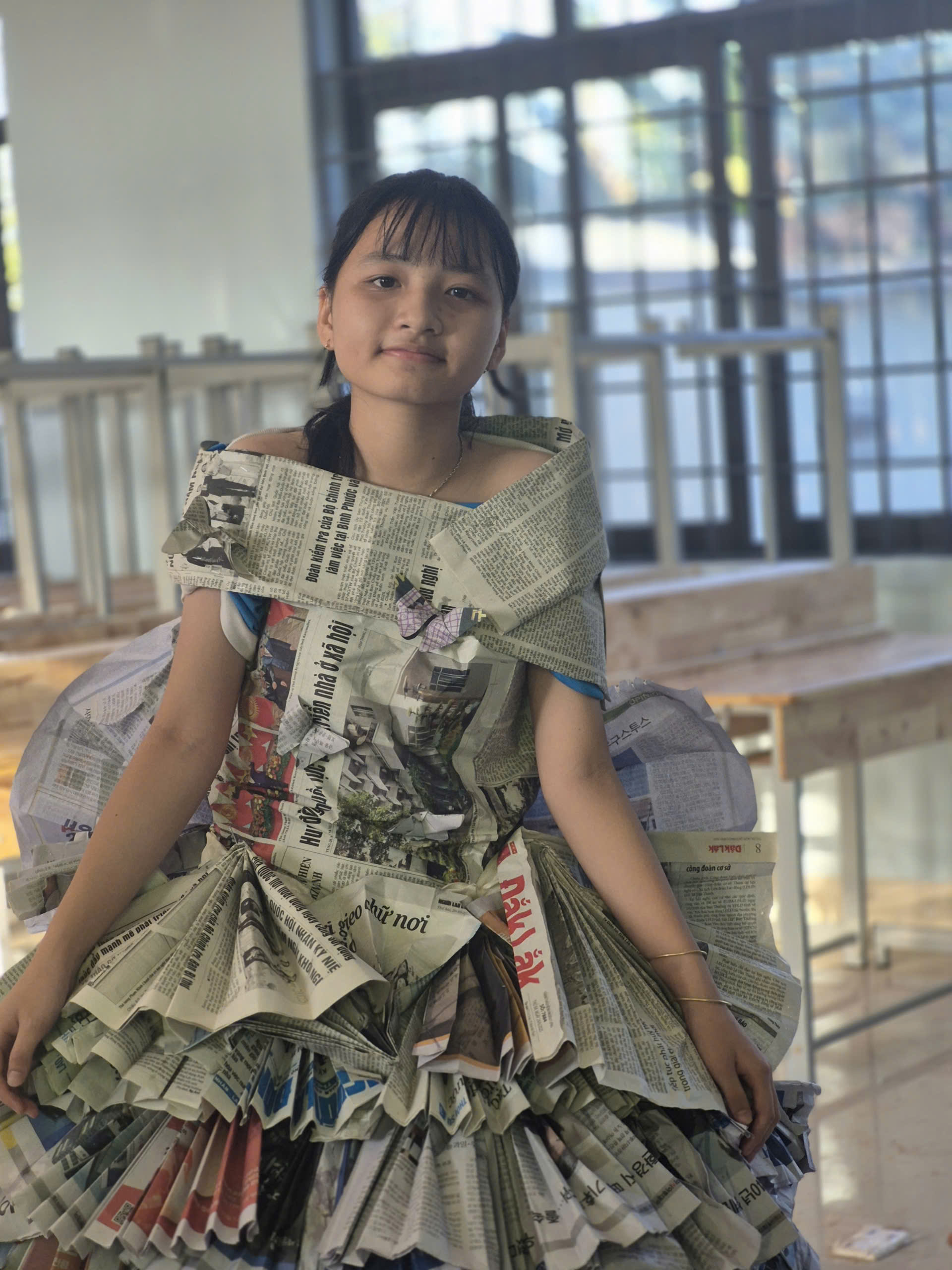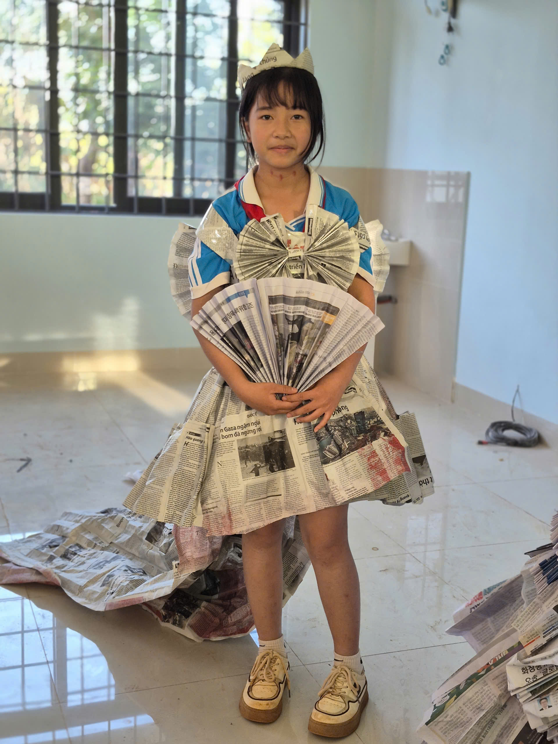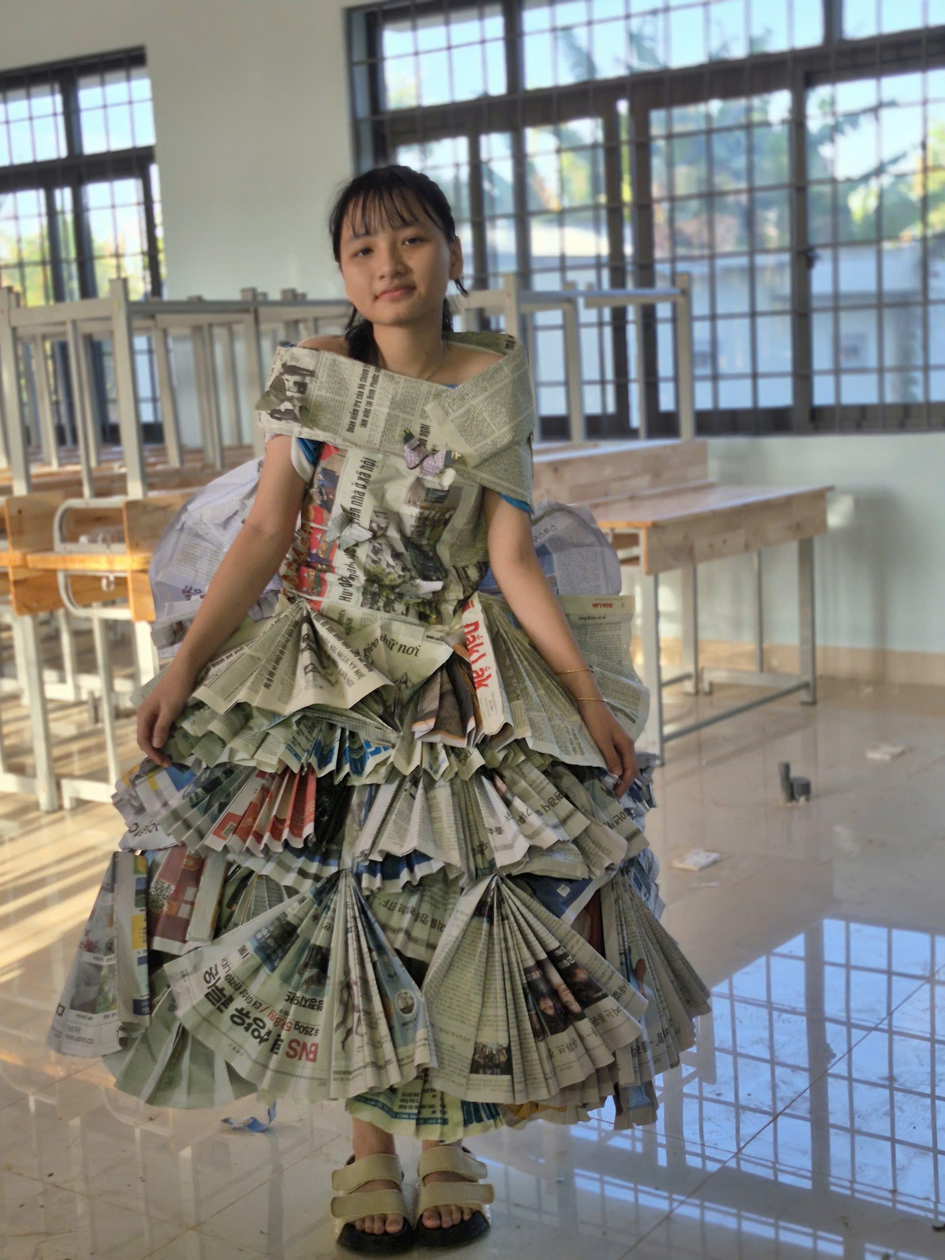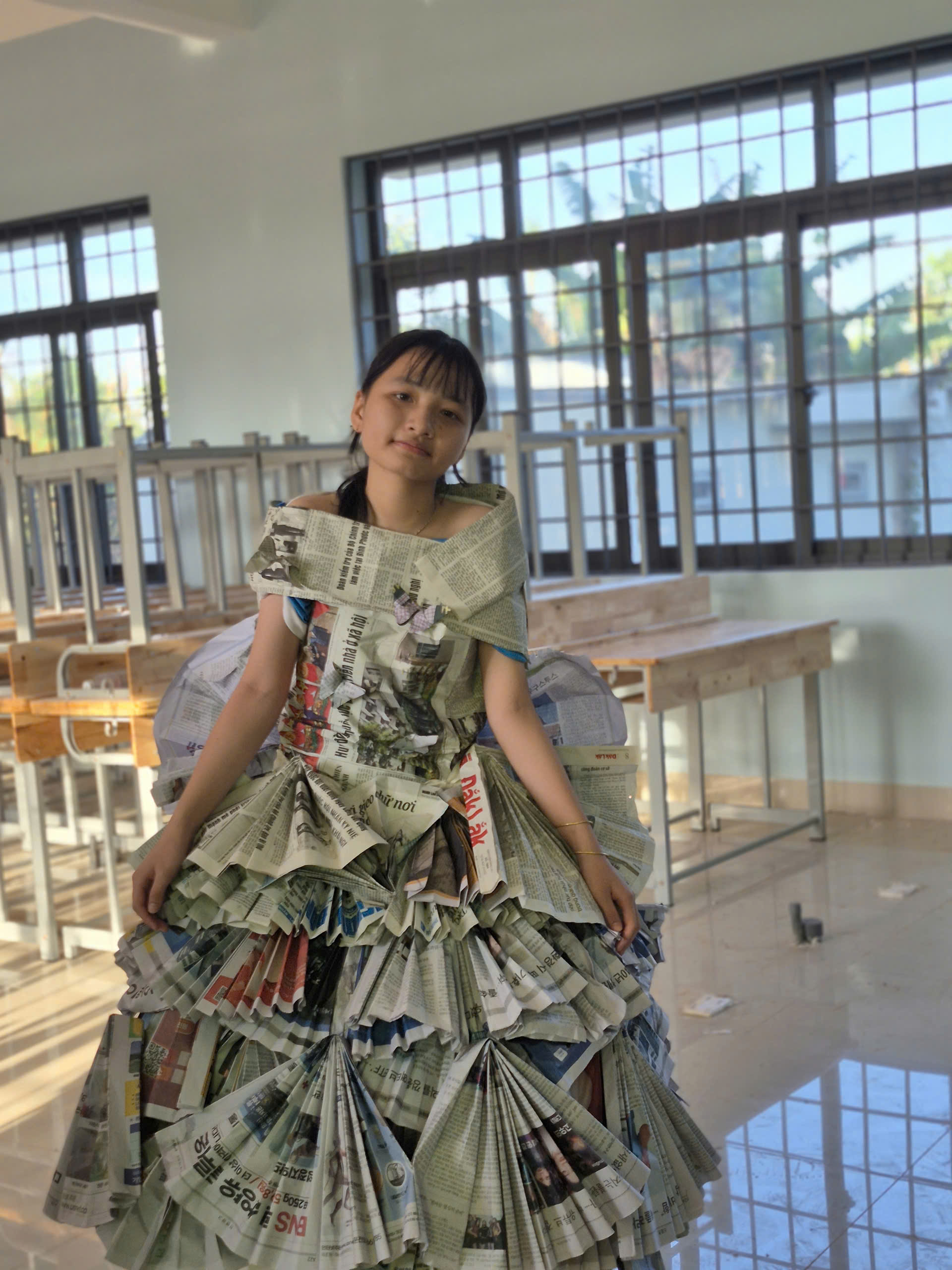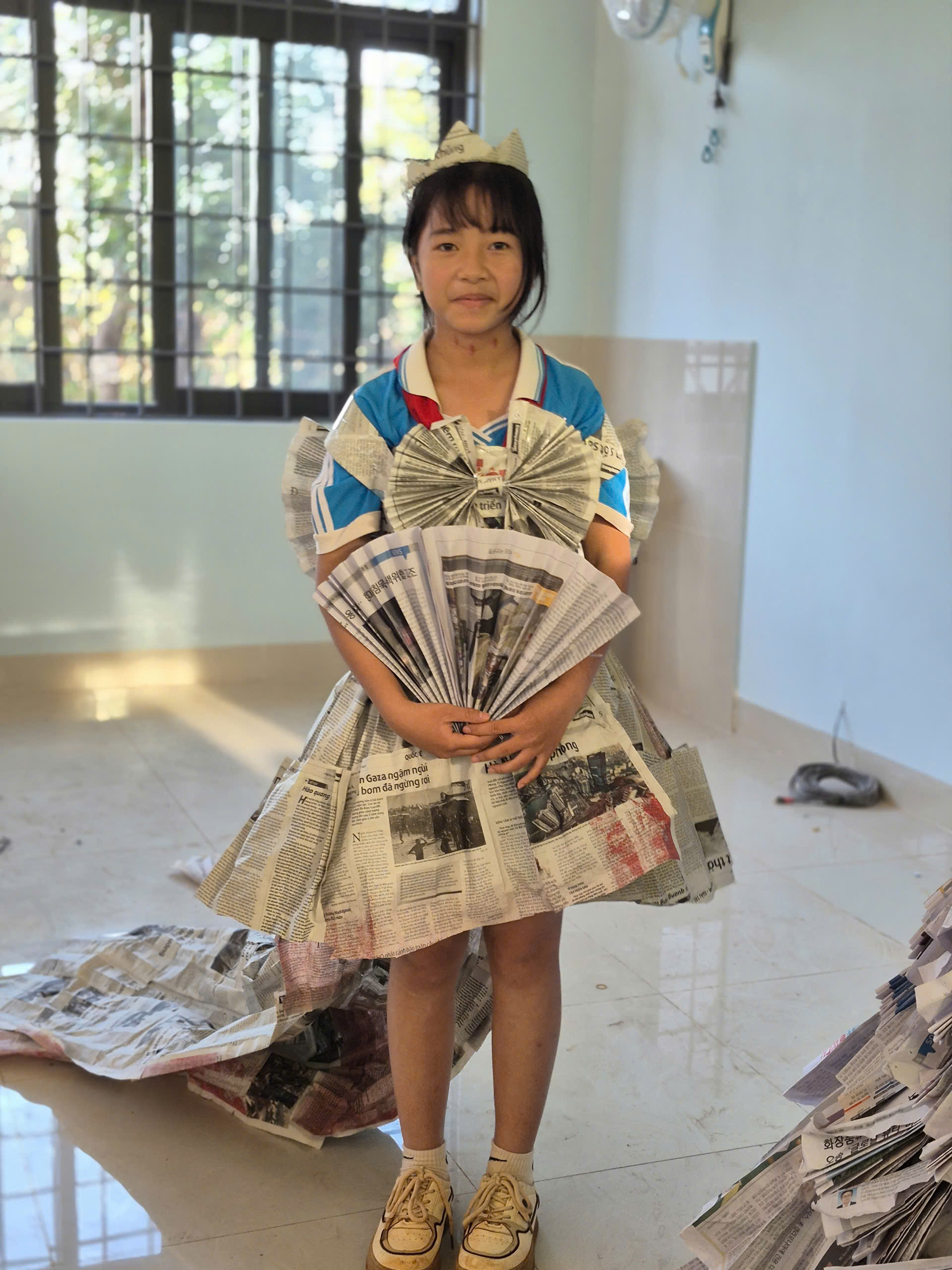 Tiếp theo chương trình là tiết mục biểu diễn thời trang tái chế của các bạn khối lớp 7. Với sự khéo léo, sáng tạo các bạn đã tạo ra những trang phục dạ hội đẹp và trình diễn trước cờ. Tạo không khí vui tươi, tự tin trình diễn của các em học sinh.